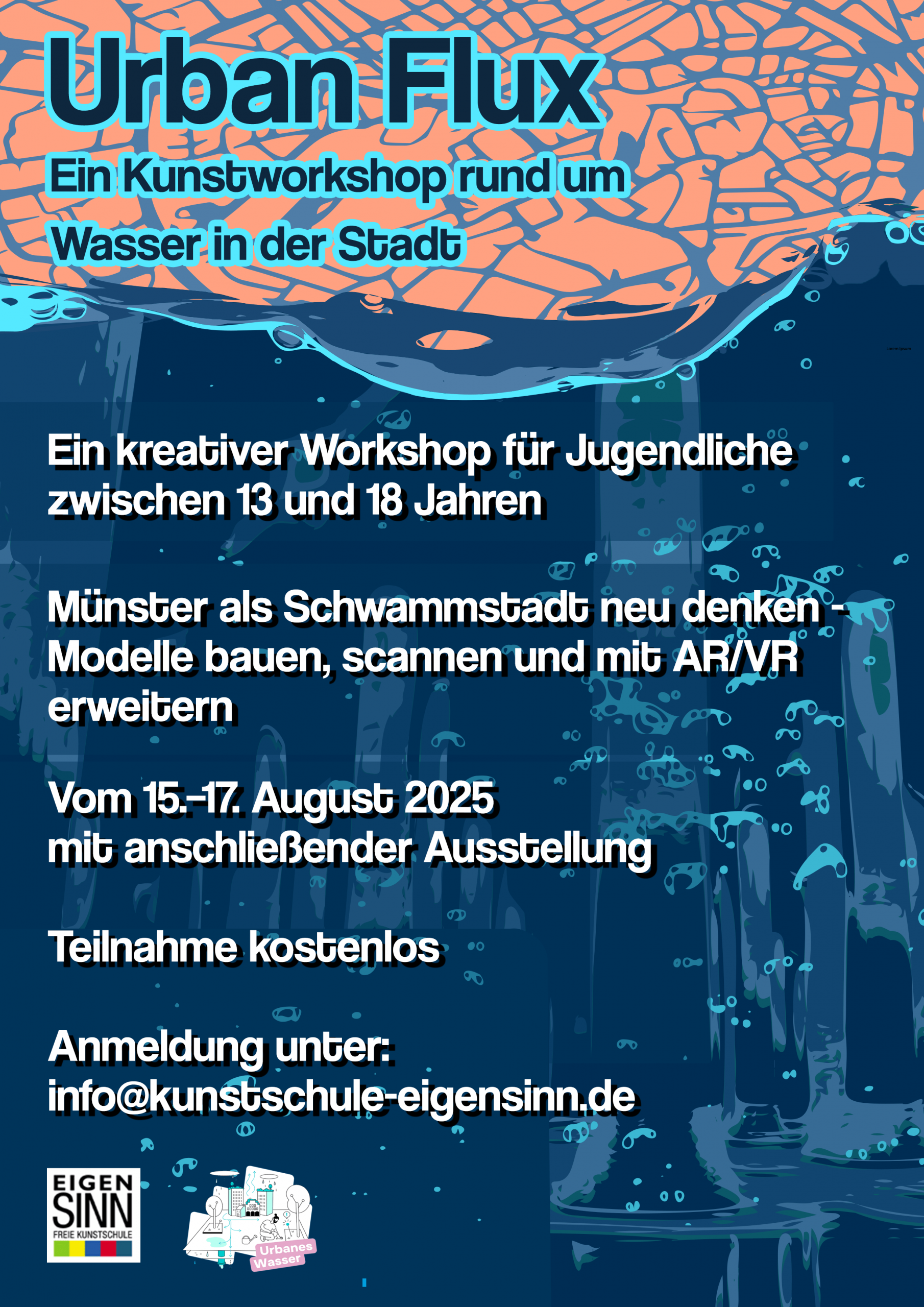 Urban Flux – Zukunftslabor zwischen Wasser und Vision lud Jugendliche von 13 bis 18 Jahren ein, Münster als Schwammstadt neu zu denken. In einem dreitägigen Workshop entwickelten sie Visionen für ein grünes, klimaresilientes Münster – analog und digital, vom Modellbau bis zur Augmented Reality. Die Ergebnisse wurden anschließend im Haus der Nachhaltigkeit präsentiert.